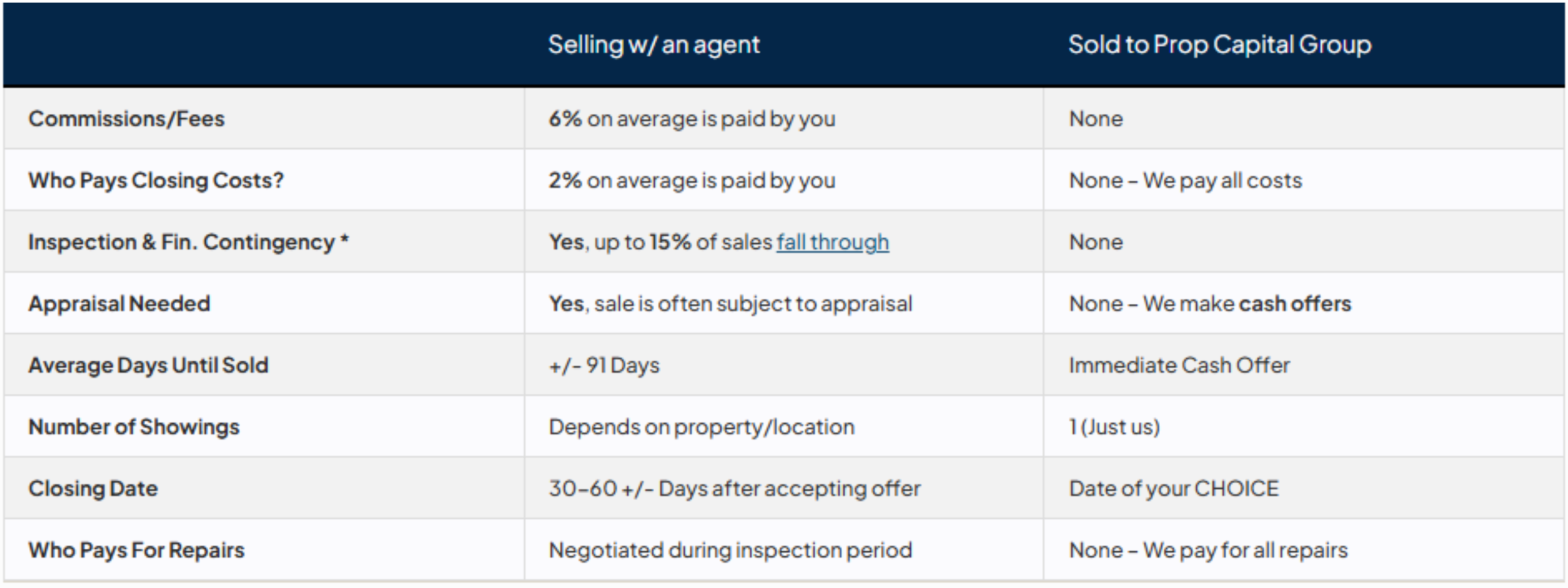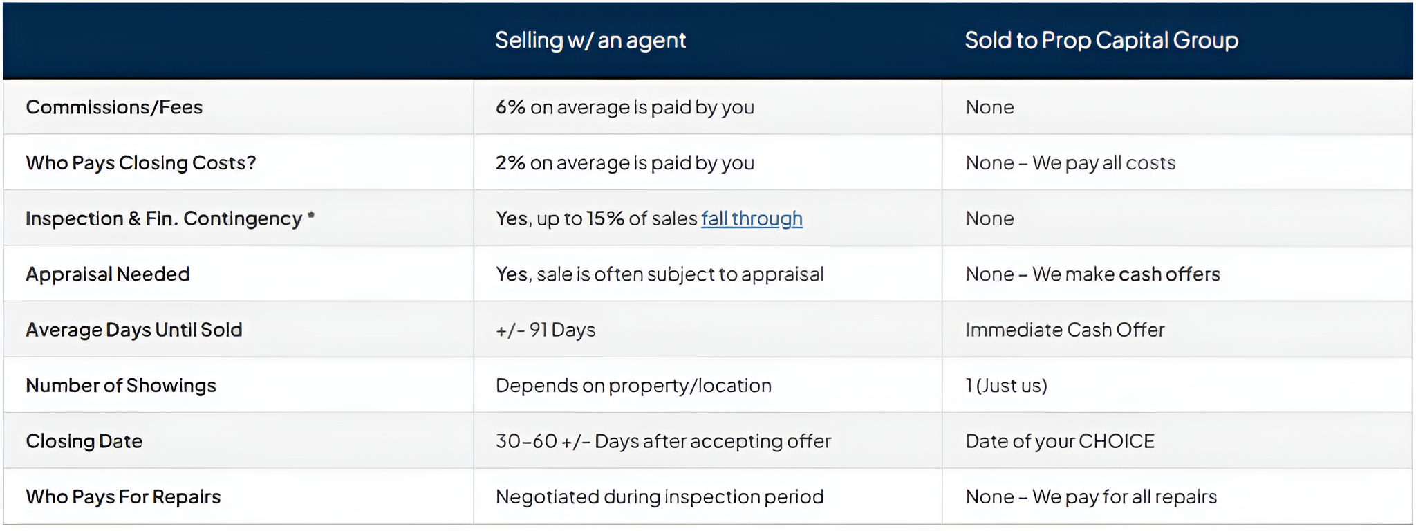 Here at Prop Capital Group we don’t use bank financing so you don’t have to worry about our ability to close on a deal.